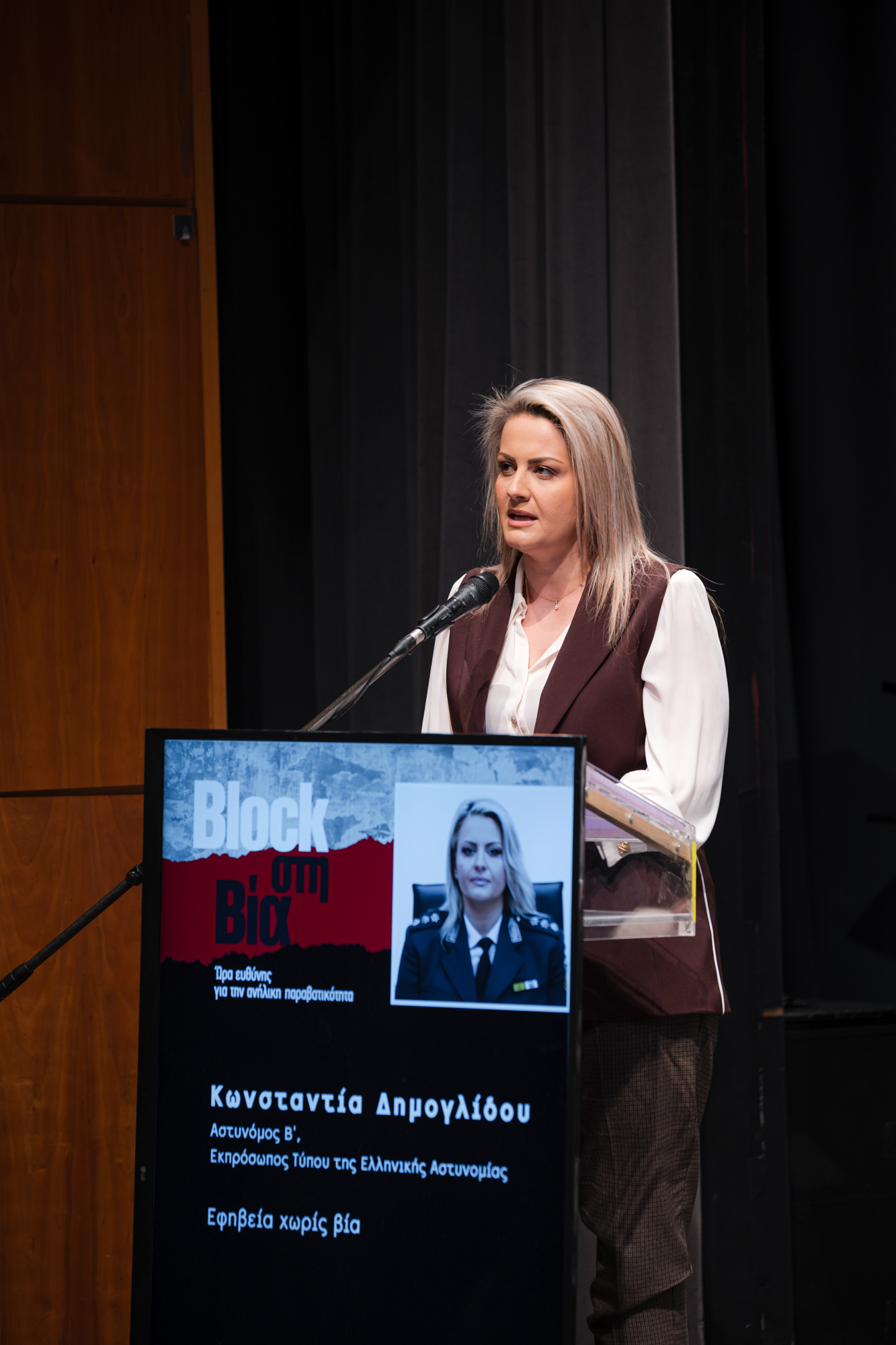 Στα ψηφιακά εργαλεία Safe Youth και Emergency Button αναφέρθηκε η Αστυνόμος Β’, Εκπρόσωπος Τύπου της Ελληνικής Αστυνομίας κ. Κωσταντία Δημογλίδου, στην ομιλία της με θέμα: «Εφηβεία χωρίς βία», επισημαίνοντας πως έχουν βοηθήσει, μαζί με τη γραμμή 10201 για την προστασία των ανηλίκων, σε σοβαρά περιστατικά και υπογραμμίζοντας πως δεν είναι ταμπού να ζητάμε βοήθεια.