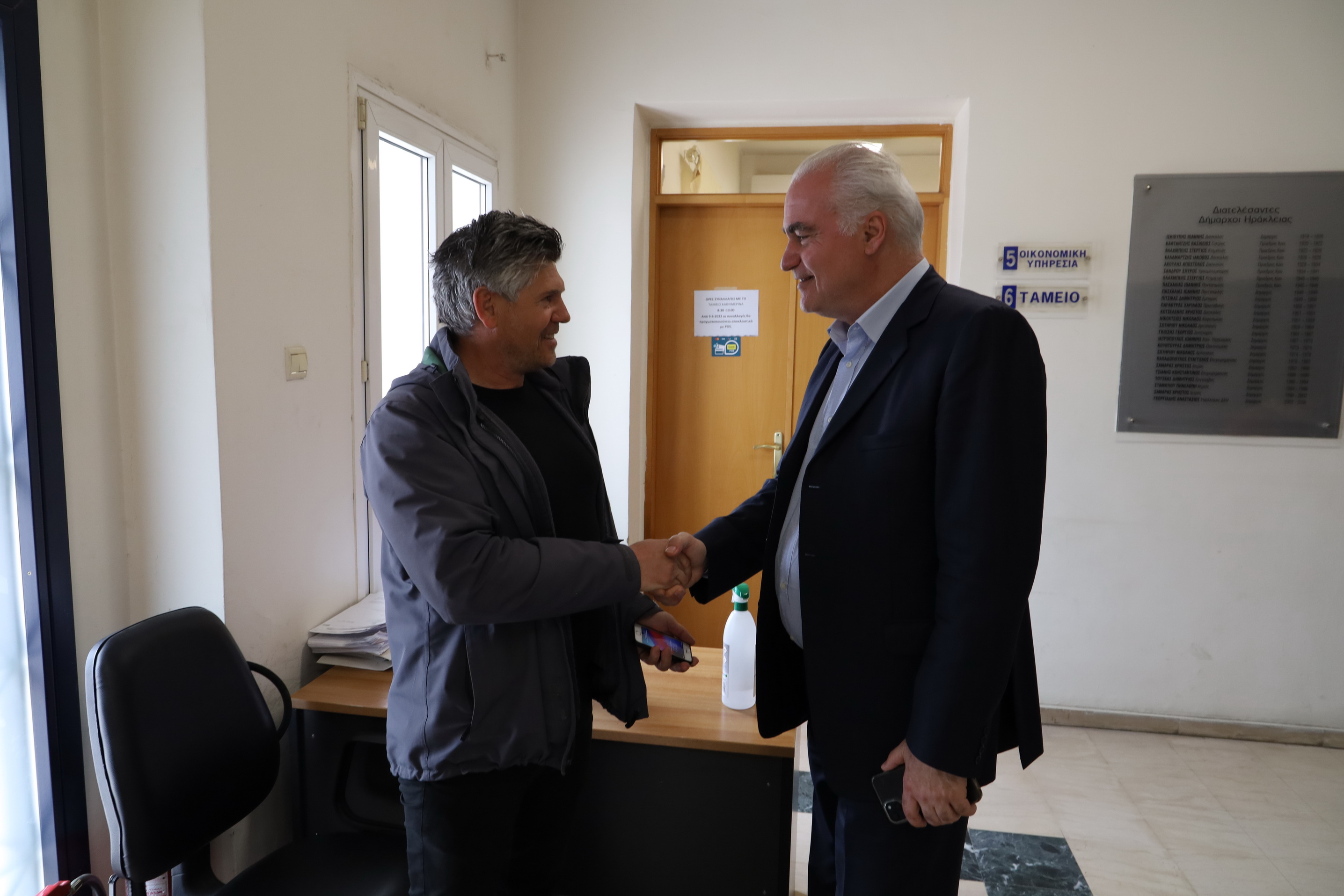 Στη συνέχεια ο κ.Βέρρος μετέβη στη Δημοτική Επιχείρηση Ύδρευσης Αποχέτευσης Ηράκλειας, όπου είχε ολιγόλεπτη συνάντηση με τον Πρόεδρο της Επιχείρησης, Δημήτρη Τζήκα και αμέσως μετά επισκέφθηκε την Ένωση Αγροτικών Συνεταιρισμών και τα ΚΔΑΠ του Δήμου.