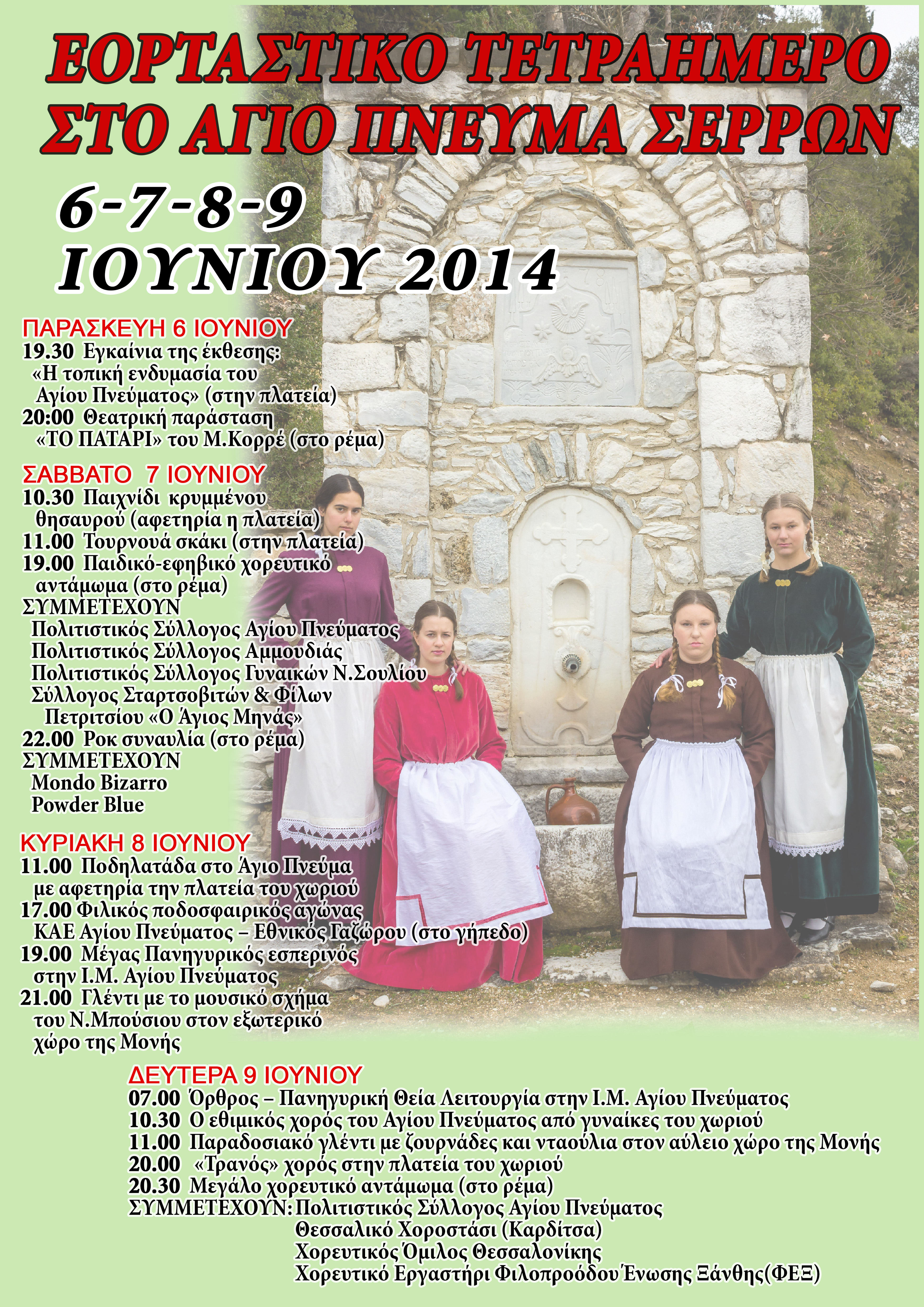 Η τοπική κοινότητα Αγίου Πνεύματος Σερρών σε συνεργασία με τον πολιτιστικό σύλλογο. τον ορειβατικό σύλλογο, την ΚΑΕ Αγίου Πνεύματος καθώς και την εκκλησιαστική επιτροπή της Ι.Μ.Αγίου Πνεύματος σας προσκαλούν στο εορταστικό τετραήμερο στο Άγιο Πνεύμα Σερρών 6-9 Ιουνίου με αφορμή την πανήγυρη της παλαιάς Ιεράς μονής Αγίου Πνεύματος και ολόκληρου του χωριού.