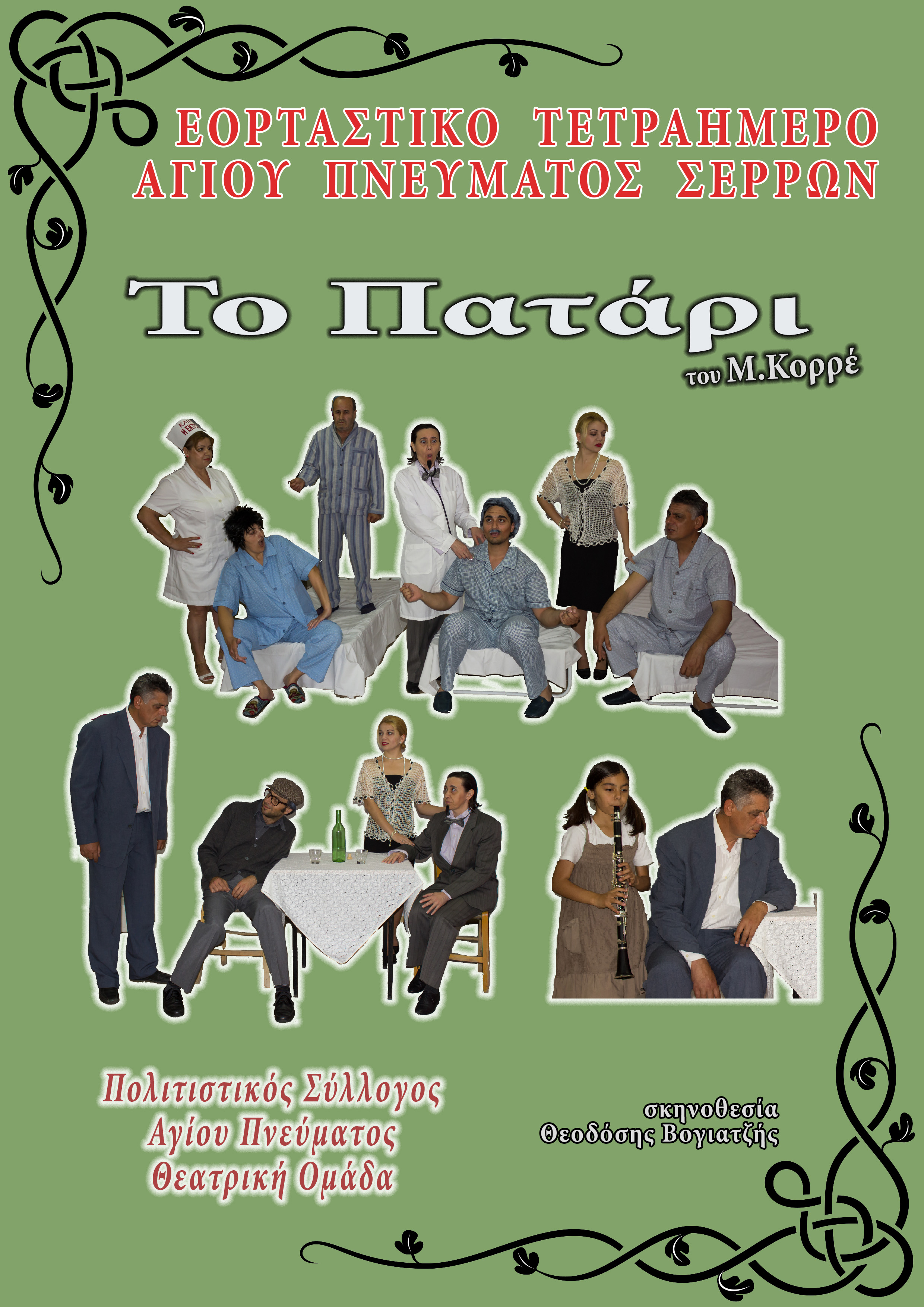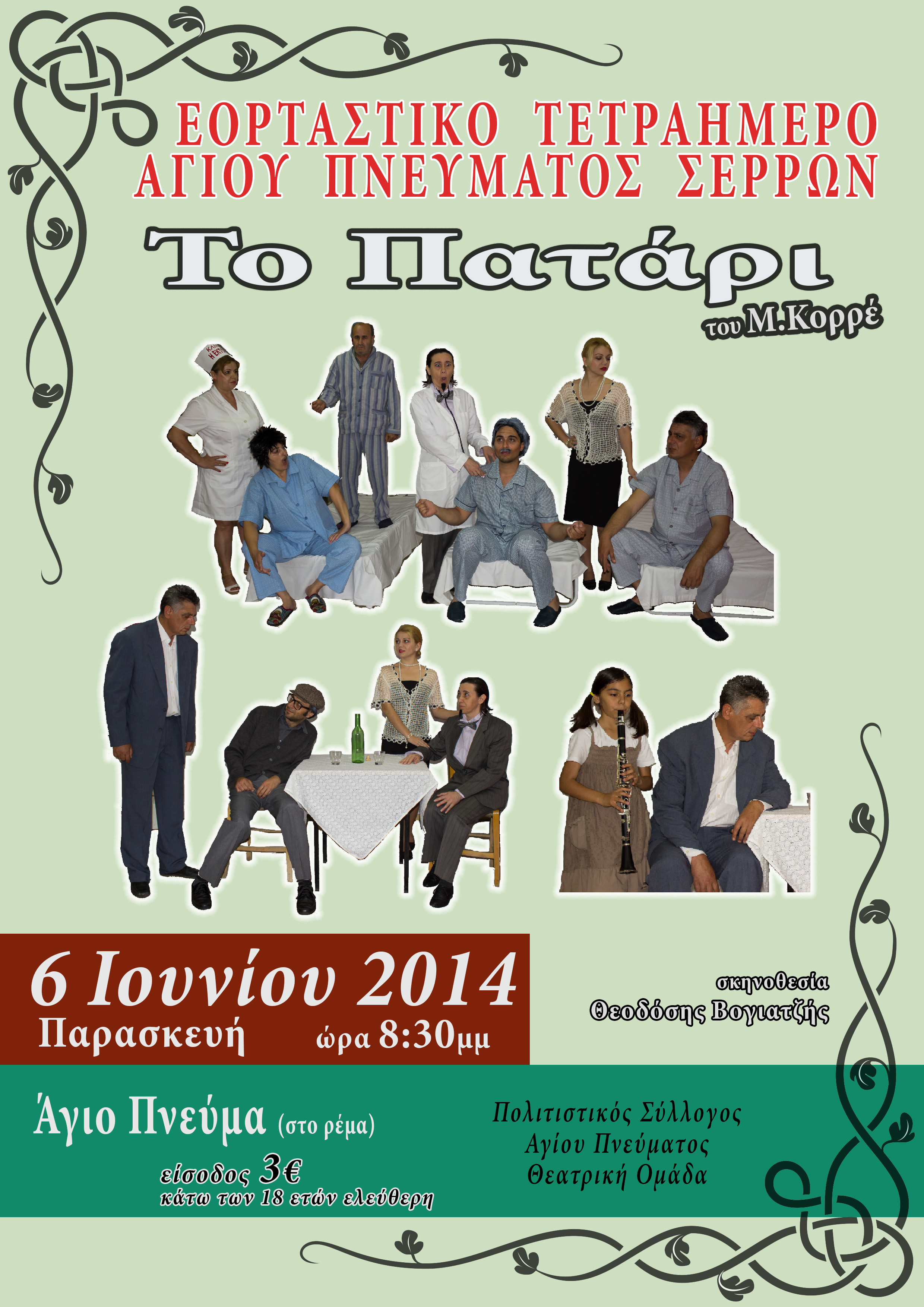 • 20:00 Θεατρική παράσταση «ΤΟ ΠΑΤΑΡΙ» του Μανώλη Κορρέ από την θεατρική ομάδα του πολιτιστικού συλλόγου Αγίου Πνεύματος (στο ρέμα)