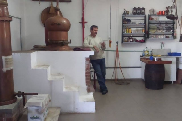 Στη συνέχεια ξενάγησε τους φιλοξενούμενους του στις εγκαταστάσεις του αποστακτηρίου και εξήγησε πως δημιουργείται το τσίπουρο ξεκινώντας αρχικά από τον τρύγο και πως ακολουθεί η διαδικασία βρασμού στο αποστακτήριο. Ο Χρυσόστομος Μπαλής έχει δημιουργήσει εδώ και χρόνια ένα υποδειγματικό αποστακτήριο με τα καζάνια του.