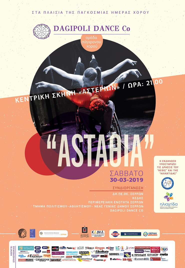 Μια χορευτική παράσταση με το έργο «ASTAΘΙΑ» από την DAGIPOLI DANCE Co μια ομάδα σύγχρονου χορού, ο πυρήνας της οποίας αποτελείται από άτομα με κινητική αναπηρία, θα δοθεί το Σάββατο στις 9 το βράδυ στην Κεντρική Σκηνή Δημοτικού Θεάτρου «Αστέρια» , στο πλαίσιο της παγκόσμιας ημέρας χορού.
