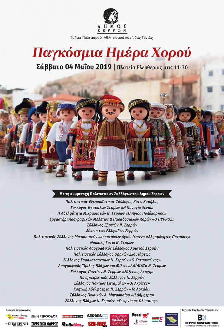 Το Τμήμα Πολιτισμού Αθλητισμού και Νέας Γενιάς του Δήμου Σερρών διοργανώνει το Σάββατο 4 Μαίου 2019 και ώρα 11.30 μμ στην Πλατεία Ελευθερίας, εκδηλώσεις στα πλαίσια του εορτασμού της «Παγκόσμιας Ημέρας Χορού».