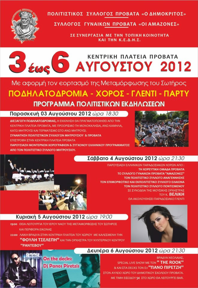Ο ΠΟΛΙΤΙΣΤΙΚΟΣ ΣΥΛΛΟΓΟΣ ''ΔΗΜΟΚΡΙΤΟΣ'' ΚΑΙ Ο ΣΥΛΛΟΓΟΣ ΓΥΝΑΙΚΩΝ ''ΑΜΑΖΟΝΕΣ'' ΤΟΥ ΠΡΟΒΑΤΑ ΣΕ ΣΥΝΕΡΓΑΣΙΑ ΜΕ ΤΗΝ ''ΤΟΠΙΚΗ ΚΟΙΝΟΤΗΤΑ'' ΚΑΙ ΤΗΝ ''Κ.Ε.ΔΗ.Σ.'' ΣΑΣ ΠΡΟΣΚΑΛΟΥΝ ΣΤΙΣ ΠΑΝΗΓΥΡΙΚΕΣ ΕΚΔΗΛΩΣΕΙΣ, ΠΟΥ ΘΑ ΠΡΑΓΜΑΤΟΠΟΙΗΘΟΥΝ ΣΤΗΝ ΚΕΝΤΡΙΚΗ ΠΛΑΤΕΙΑ ΤΟΥ ΧΩΡΙΟΥ, ΑΠΟ ΠΑΡΑΣΚΕΥΗ 3 ΕΩΣ ΔΕΥΤΕΡΑ 6 ΑΥΓΟΥΣΤΟΥ 2012, ΜΕ ΤΗΝ ΑΦΟΡΜΗ ΤΟΥ ΕΟΡΤΑΣΜΟΥ ΤΗΣ ΜΕΤΑΜΟΡΦΩΣΗΣ ΤΟΥ ΣΩΤΗΡΟΣ.