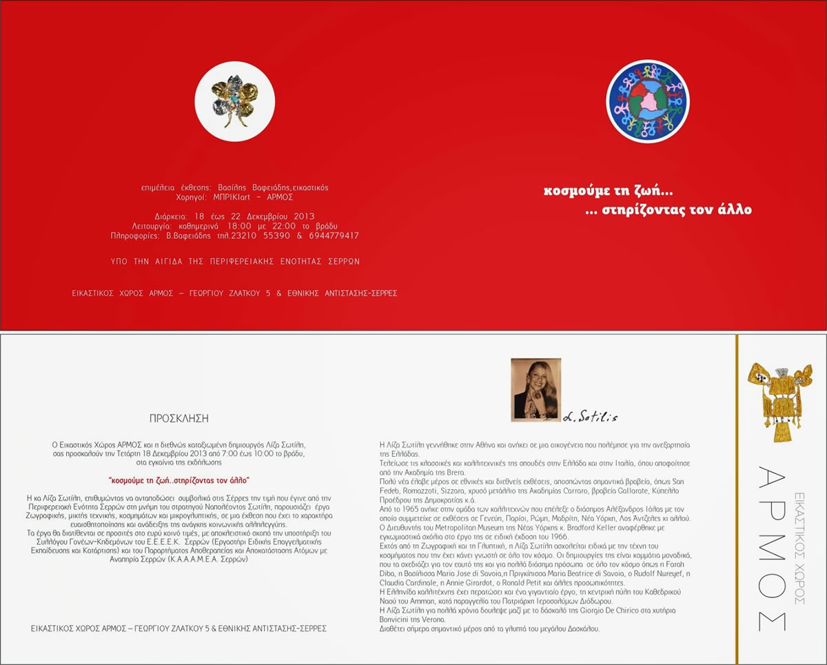 Ο ΑΡΜΟΣ και η διεθνώς καταξιωμένη δημιουργός Λίζα Σωτίλη , προσκαλούν το κοινό την Τετάρτη 18 Δεκεμβρίου 2013, από 7:00 έως 10:00 το βράδυ, στα εγκαίνια της εκδήλωσης αλληλεγγύης