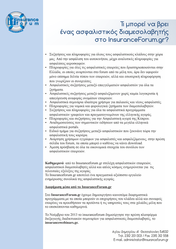 Μέχρι τον Οκτώβριο του 2014 το insuranceforum.gr είχε διοργανώσει ημερίδες σε Αθήνα, Θεσσαλονίκη, Ηράκλειο Κρήτης,Βόλο και Κοζάνη, τις οποίες παρακολούθησαν εκατοντάδες ασφαλιστικοί διαμεσολαβητές.