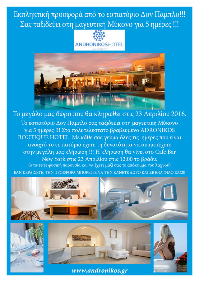 Το μεγάλο μας δώρο που θα κληρωθεί στις 23 Απριλίου 2016. Το εστιατόριο Δον Πάμπλο σας ταξιδεύει στη μαγευτική Μύκονο για 5 ημέρες !!! Στο πολυτελέστατο βραβευμένο ADRONIKOS BOUTIQUE HOTEL. Με κάθε σας γεύμα όλες τις ημέρες που είναι ανοιχτό το εστιατόριο έχετε τη δυνατότητα να συμμετέχετε στην μεγάλη μας κλήρωση !!!