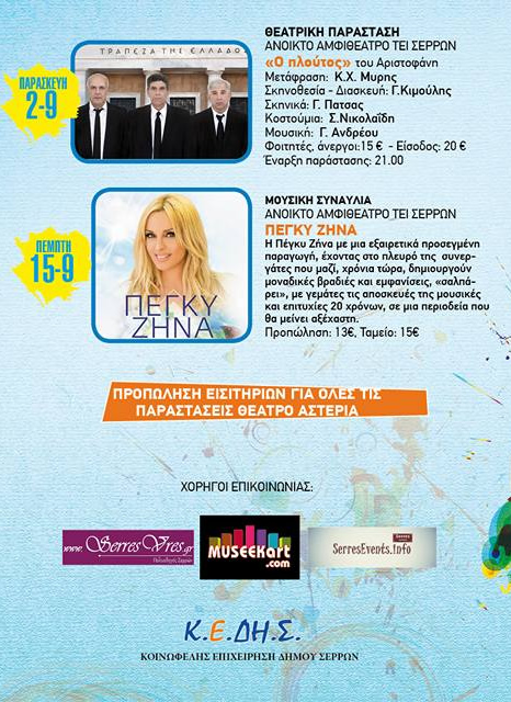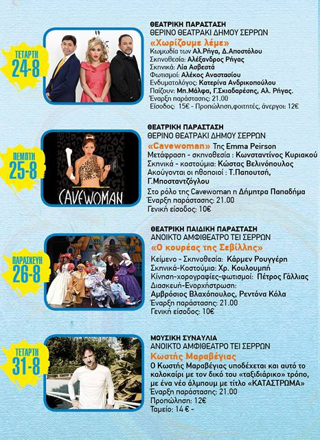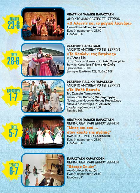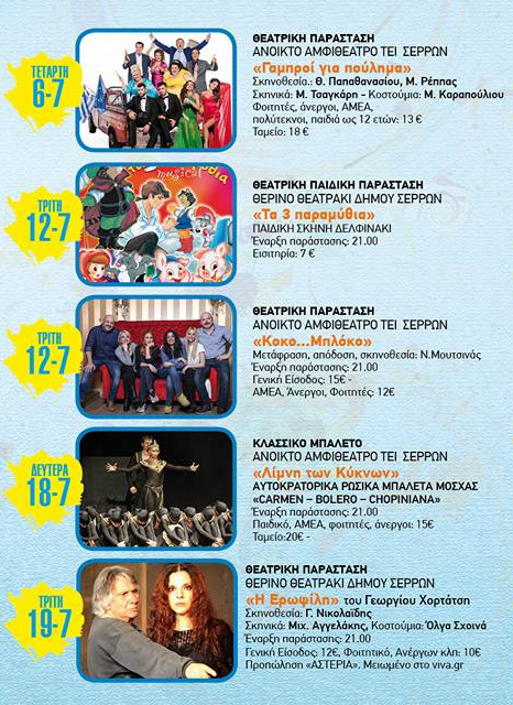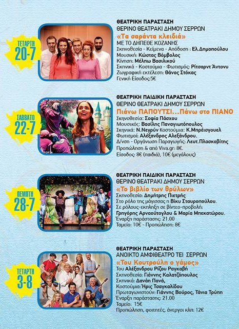 «Το πρόγραμμα περιλαμβάνει θεατρικές παραστάσεις και συναυλίες που θα γίνουν κατά την διάρκεια του στο ανοικτό Αμφιθέατρο του ΤΕΙ και στο Θερινό Θεατράκι του δήμου Σερρών για πρώτη φορά . Είναι διοργάνωση που έχει αναλάβει η ΚΕΔΗΣ σε συνεργασία με το ΤΕΙ ,με την παραχώρηση του αμφιθεάτρου . Οι παραστάσεις είναι με καταβολή εισιτηρίου» δήλωσε ο κ. Ραμπότας και συνεχίζοντας τόνισε « Οι Σερραίοι που θα μείνουν στην πόλη το καλοκαίρι μπορούν να παρακολουθήσουν το πρόγραμμα. Υπάρχει μια ποικιλία παραστάσεων τόσο για τους ενήλικες όσο και για τα παιδιά. Να σημειώσουμε ότι έχουμε αρκετές παιδικές παραστάσεις που θα πραγματοποιηθούν από θιάσους των Αθηνών και της Θεσσαλονίκης με πολύ καλό περιεχόμενο, διδακτικό και διασκεδαστικό. Είναι αυτό που λέμε ότι το θέατρο συμβάλει απόλυτα στον πολιτισμό».