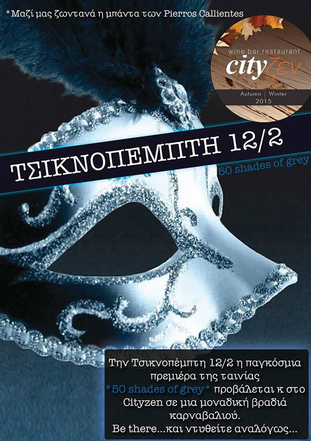 Την Τσικνοπέμπτη 12/2 η παγκόσμια πρεμιέρα της ταινίας *50 shades of grey* προβάλλεται και στο Cityzen σε μια μοναδική βραδιά καρναβαλιού!