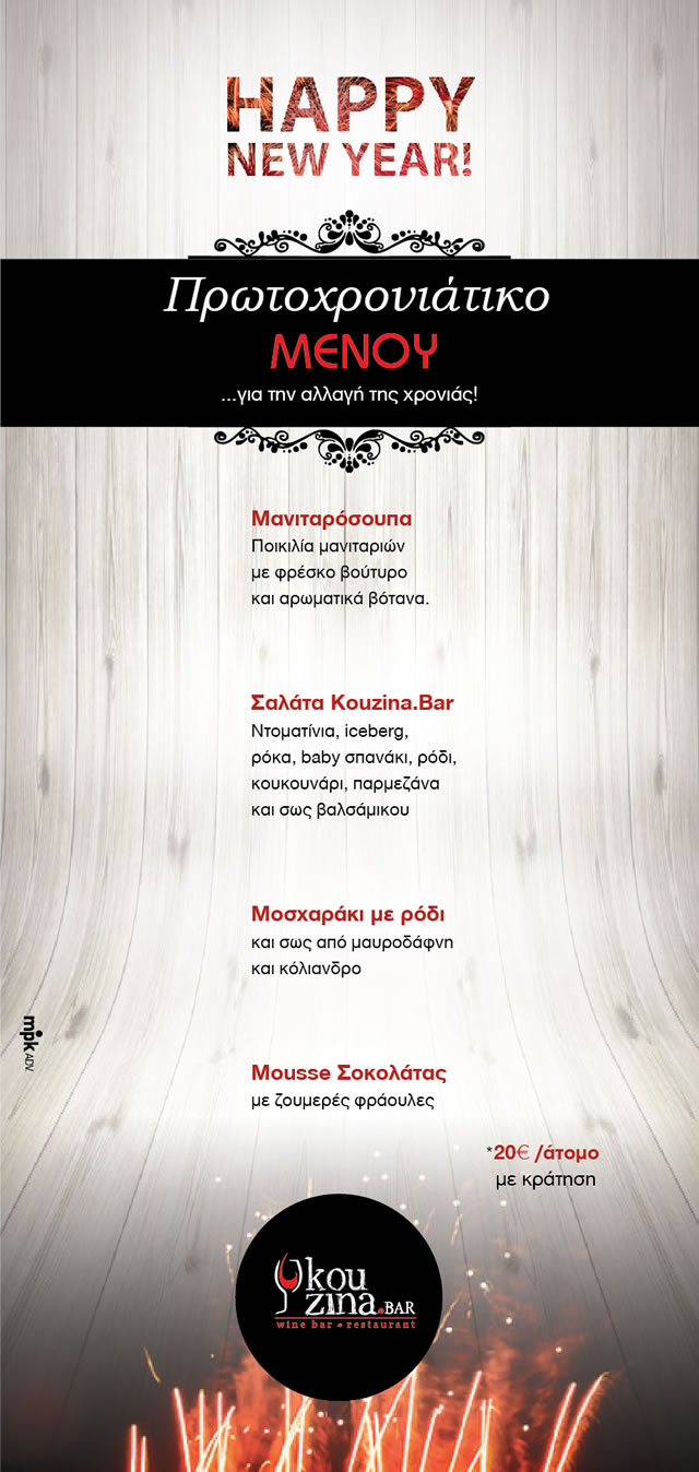 Ημέρες γιορτινές, ημέρες χαράς και όλοι ψάχνουν το ιδανικό μέρος για να καλωσορίσουν με τα αγαπημένα τους πρόσωπα το νέο χρόνο! Με 20€ το άτομο το Kouzina Bar προτείνει το Πρωτοχρονιάτικο μενού για την αλλαγή της χρονιάς!