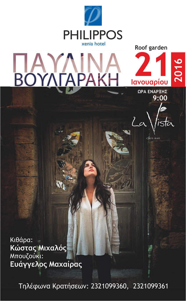 Η Παυλίνα μαζί με δύο ταλαντούχους μουσικούς , τον Κώστα Μιχαλό (κιθάρα) και τον Ευάγγελο Μαχαίρα (μπουζούκι), θα βρίσκονται στις Σέρρες στο roof garden του ξενοδοχείου Philippos Xenia Hotel την Πέμπτη 21 Ιανουαρίου, όπου θα μας χαρίσουν μια βραδιά γεμάτη όμορφες μουσικές και συναισθήματα.