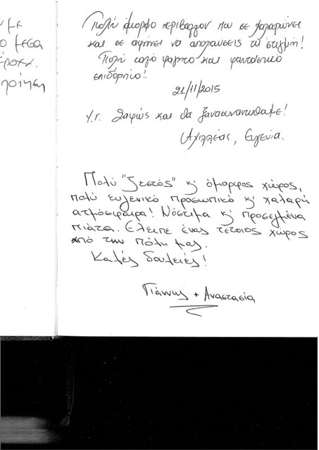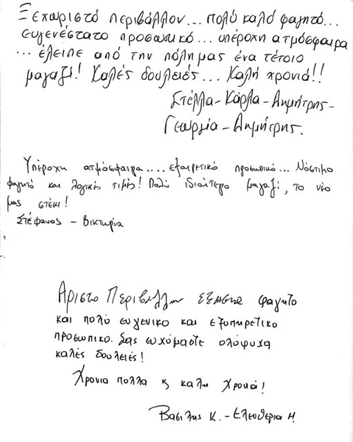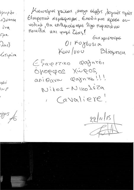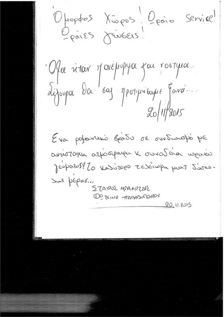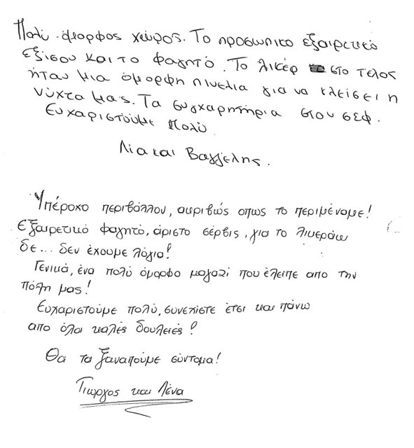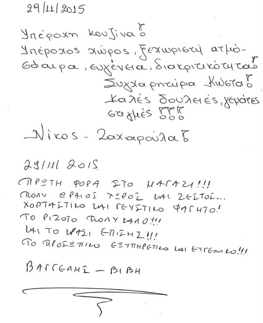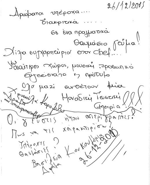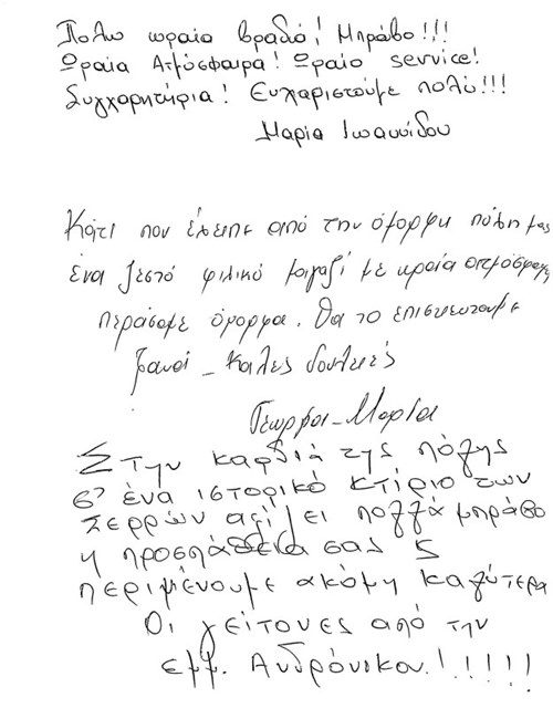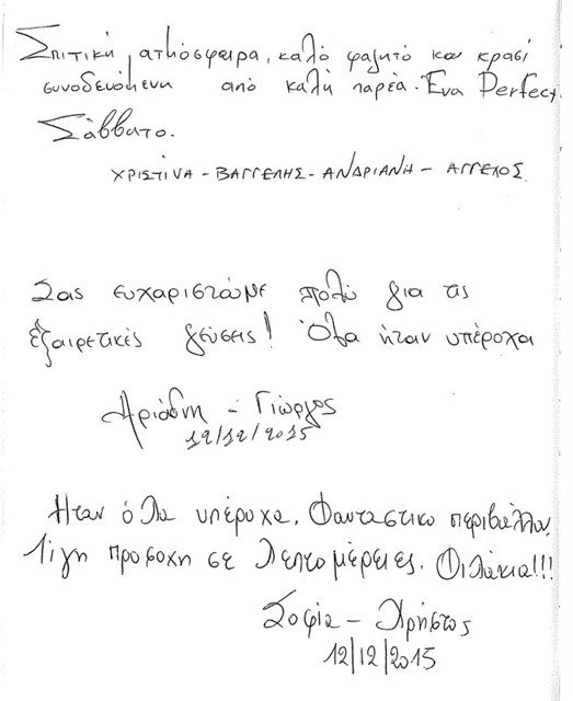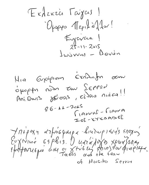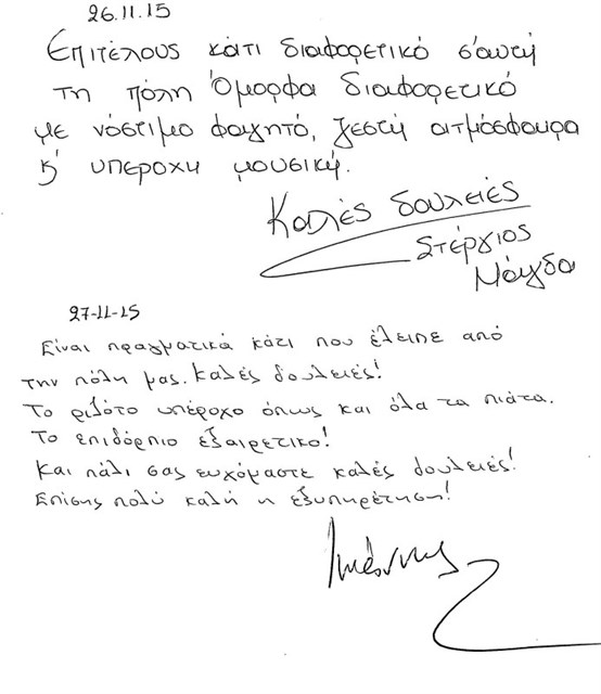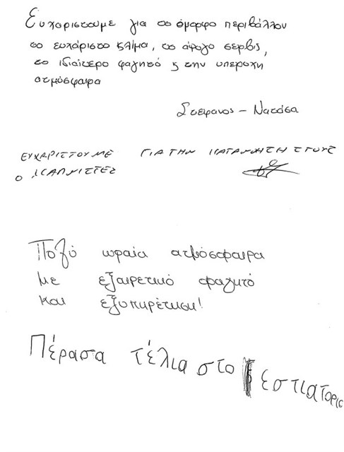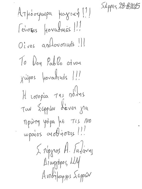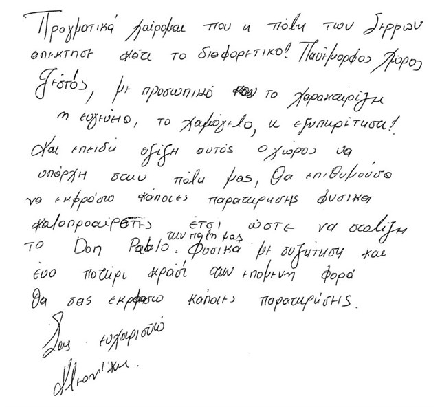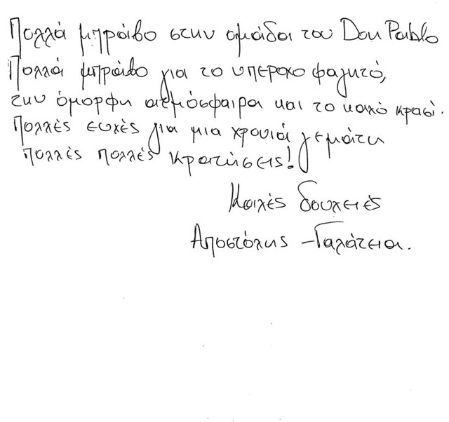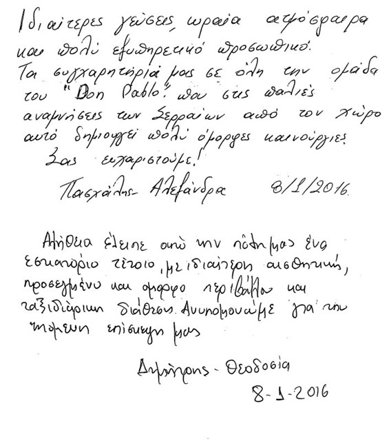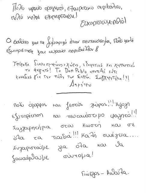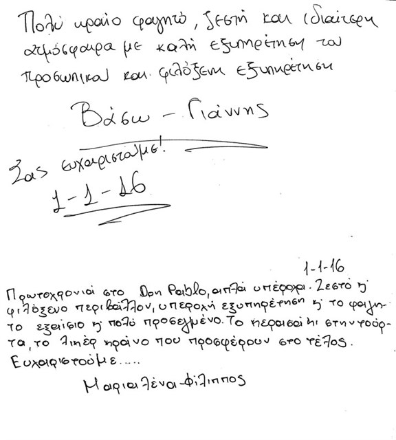 Δεν φτάνει, όμως, μόνο η δική μας εντύπωση, έφτασε ο καιρός να ανοίξουμε το βιβλίο επισκεπτών που βρίσκεται στο χώρο του εστιατορίου και εκεί έχει την ευκαιρία ο κάθε επισκέπτης να γράψει την γαστρονομική εμπειρία που αποκόμοισε από την επίσκεψή του στο πολυφημισμένο Δον Πάμπλο.