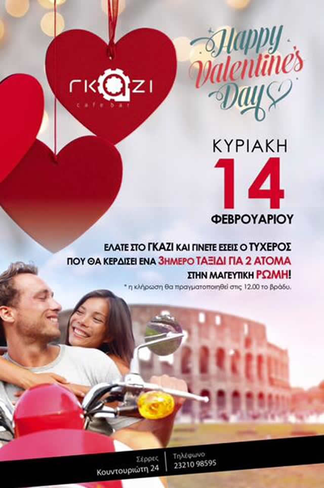 Την Κυριακή 14 Φεβρουαρίου γιορτάζουμε την πιο ερωτική μερα του χρόνου σε ενα #Greekζ_come_out διαφορετικό απο τα άλλα και σας ταξιδεύουμε στη μαγευτική Ρώμη. Ελάτε στο Γκάζι και γίνετε εσείς ο τυχερός που θα κερδίσει ένα 3ήμερο ταξίδι για 2 άτομα στη μαγευτική Ρώμη.