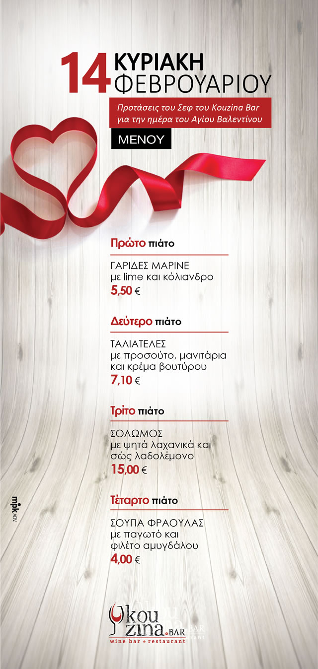Το Kouzina Bar είναι προετοιμασμένο πολύ καλά για αυτή την ημέρα και περιμένει όλα τα ερωτευμένα ζευγάρια να γιορτάσουν αυτή την ημέρα!