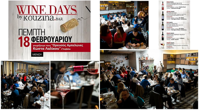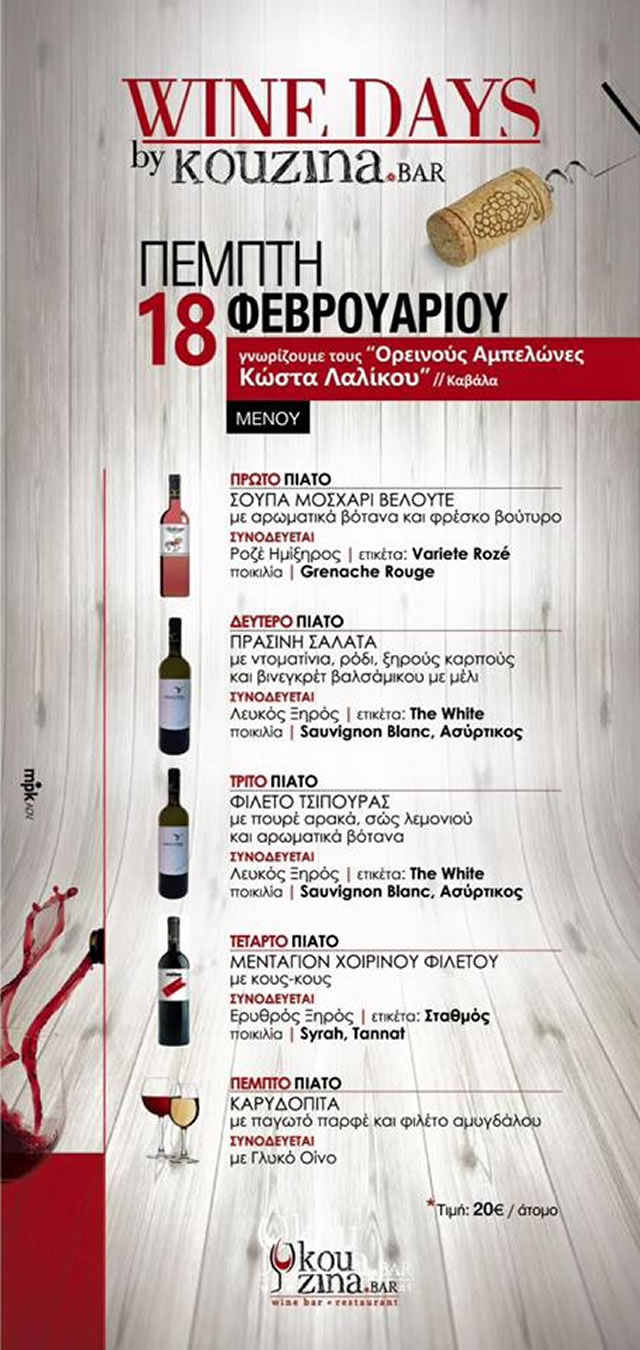 Αυτή την Πέμπτη 18 Φεβρουαρίου υποδεχόμαστε εξαιρετικά κρασιά από τους Ορεινούς αμπελώνες του Κώστα Λαλίκου στην Καβάλα σε συνδυασμό με γαστρονομικές προτάσεις του chef του Kouzina Bar σε πολύ καλές τιμές και σε ένα περιβάλλον που ξεχωρίζει σε όλα του!