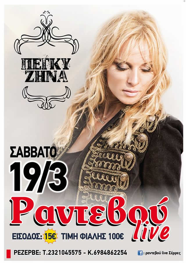 Το Σάββατο 19 Μαρτίου η αγαπημένη Πέγκυ Ζήνα, μαζί με το επιτελείο της, στο «Ραντεβού live stage» για μια μοναδική εμφάνιση! Τηλέφωνα reserve: 23210 45575, 6984862254.