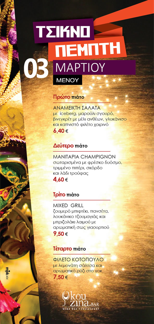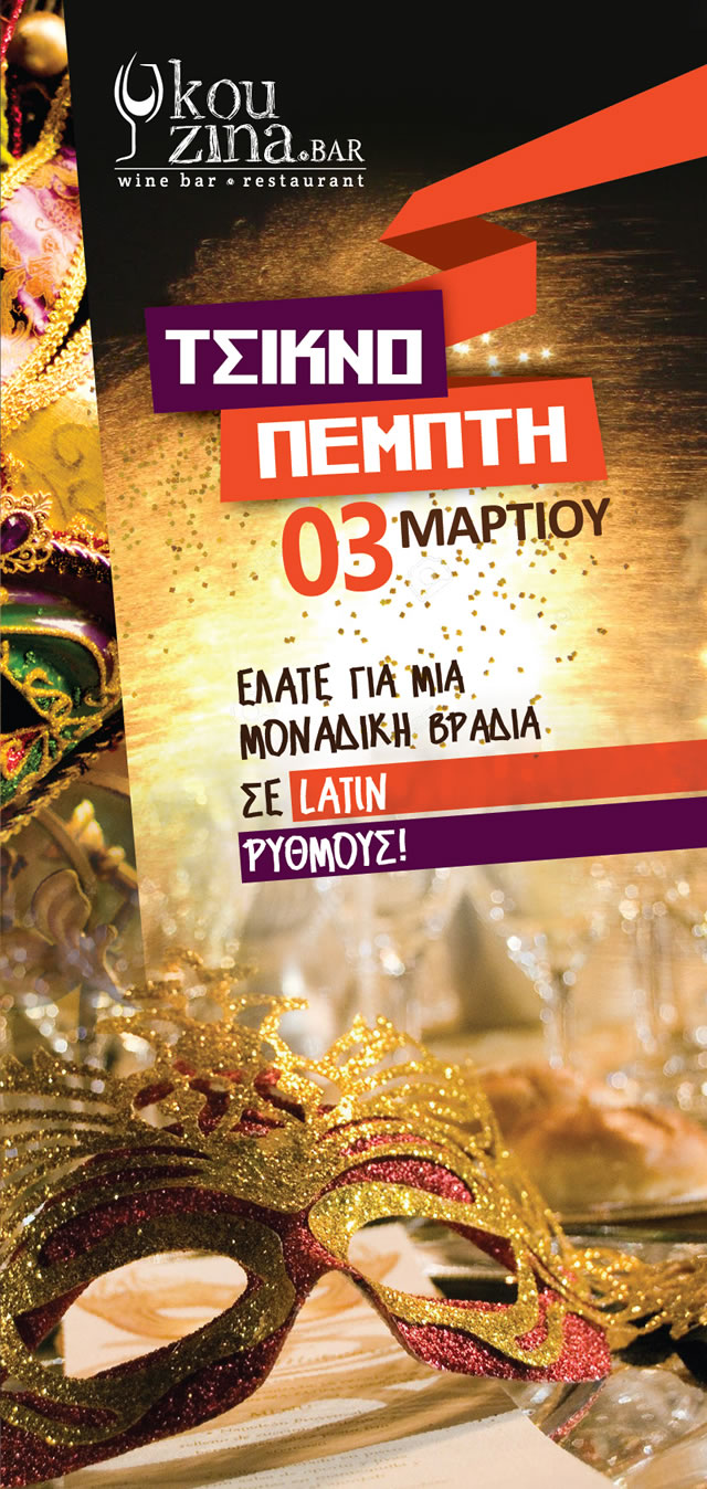 Μια όμορφη βραδιά με πολύ ωραίο φαγητό, σε ένα πολύ ωραίο περιβάλλον και σε Latin ρυθμούς η Τσικνοπέμπτη στις Σέρρες έχει την τιμητική της στο Kouzina Bar! Τηλέφωνο κρατήσεων στο 23211 81000