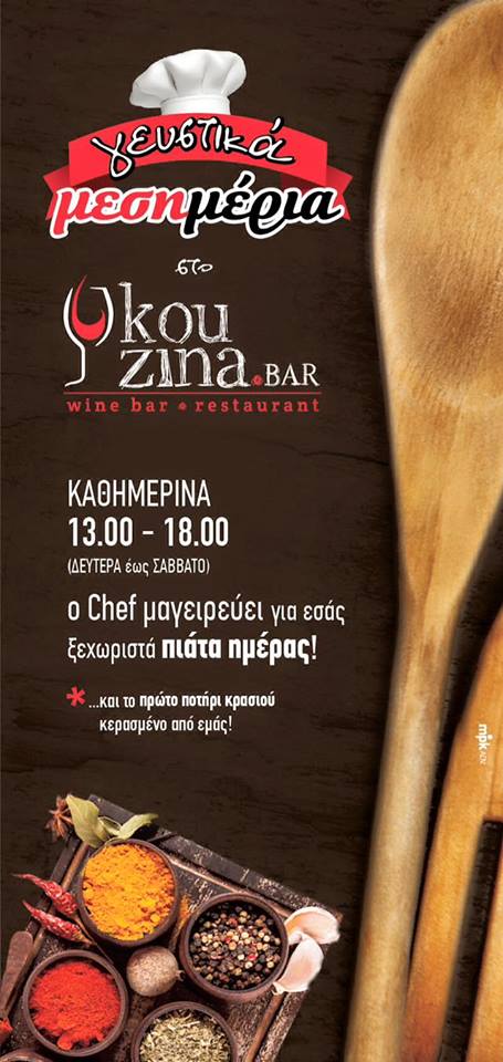 Από εδώ και στο εξής τα μεσημέρια μας αποκτούν τη γεύση που τους αξίζει! Ο σεφ του Kouzina Bar φοράει τα γάντια του, βάζει... φωτιά στην κουζίνα του, προετοιμάζει τα υλικά του και φτιάχνει για εμάς μοναδικά πιάτα ημέρας!