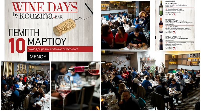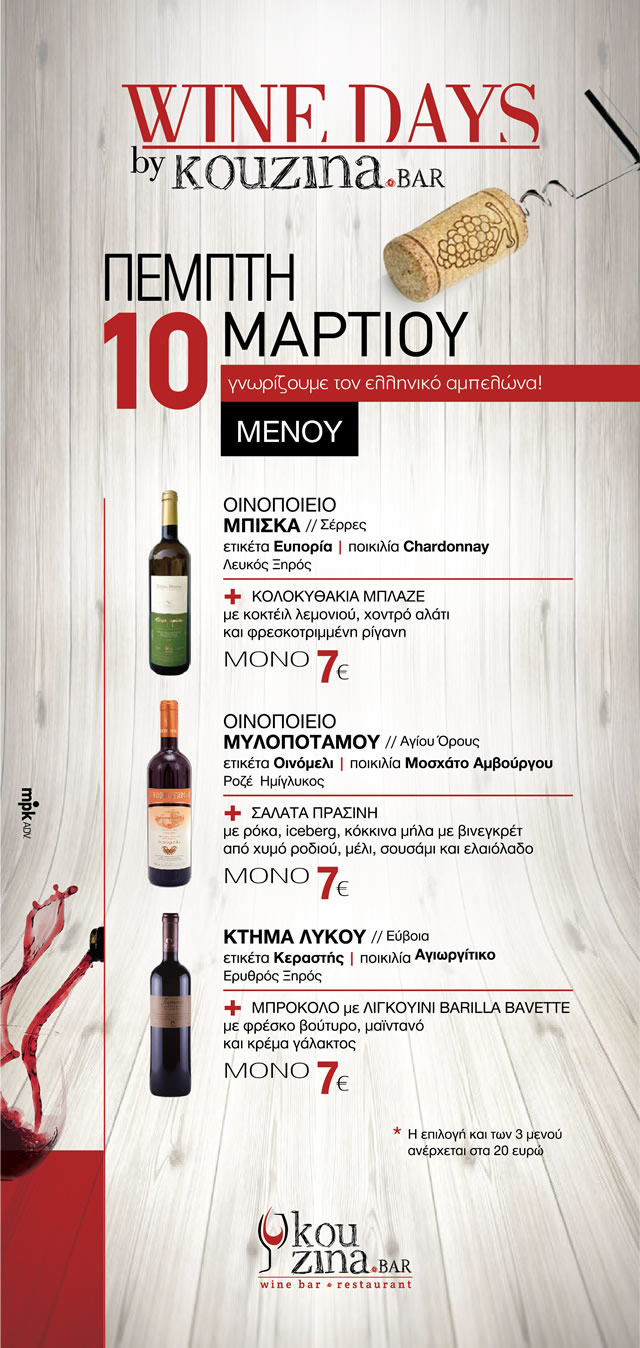 Αυτή την Πέμπτη 10 Μαρτίου υποδεχόμαστε εξαιρετικά κρασιά και γνωρίζουμε τον Ελληνικό αμπελώνα από 3 οινοποιία σε συνδυασμό με γαστρονομικές προτάσεις του chef του Kouzina Bar σε πολύ καλές τιμές και σε ένα περιβάλλον που ξεχωρίζει σε όλα του!