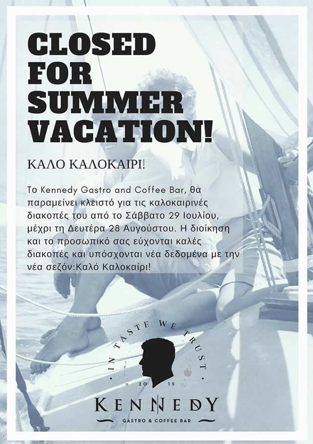Ήρθε η ώρα και για τις διακοπές του Kennedy! Από το Σάββατο 29 Ιουλίου κλείνει για έναν περίπου μήνα, για ένα υπέροχο Καλοκαίρι! Τα λέμε πάλι τη Δευτέρα 28 Αυγούστου, στο νούμερο ένα coffee spot της πόλης με νέα δεδομένα και πολλές εκπλήξεις!!!