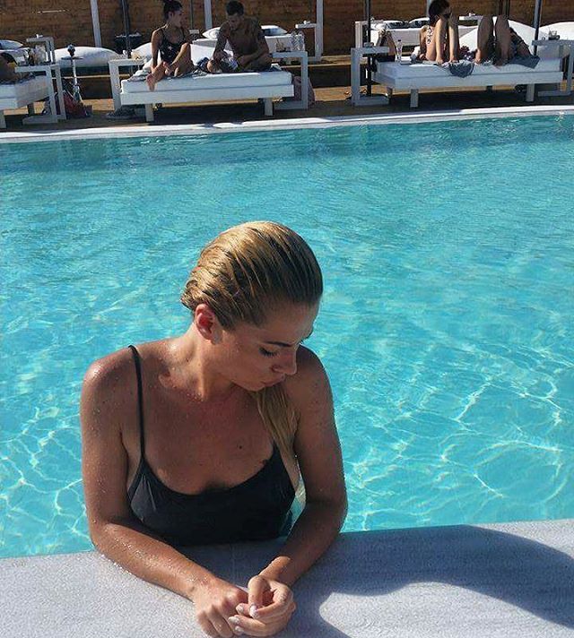 Η όμορφη ξανθιά αυτές τις ημέρες βρίσκεται στην Θεσσαλονίκη και ο φακός την πέτυχε να χαλαρώνει σε πισίνα με μαύρο ολόσωμο μαγιό.