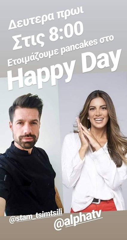 Δείτε το βίντεο με τον Γιάννη στην εκπομπή HAPPY DAY στον ALPHA που παρουσιάζει η Σταματίνα Τσιμτσιλή, όπου παρουσίασε συνταγές από τα πολύ νόστιμα Chocolate Pancakes.