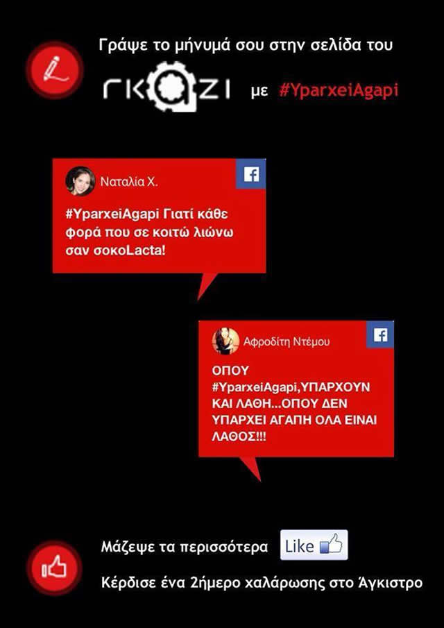 Μέσα από τη σελίδα του ΓΚΑΖΙ, η Lacta χρησιμοποιεί το hashtag #yparxeiagapi σε Twitter, Facebook και Instagram, προβάλλοντας τα πιο δημοφιλή μηνύματα σε banners. Τόλμησε να κάνεις το πρώτο βήμα, γράφοντας το δικό σου μήνυμά με #yparxeiAgapi στην δικιά μας σελίδα του FACEBOOK, στην σελίδα του ΓΚΑΖΙ..μάζεψε τα περιςςοτερα LIKE και κέρδισε ένα διήμερο χαλάρωσης στο Αγκιστρο μαζι με αγαπημένες σοκολάτες της αρεσκείας σας..!!!