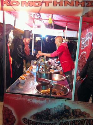 Παλαιότερα έξω από κάθε μαγαζί στηνόταν και το λεγόμενο μαγκάλι, μια ψησταριά δηλαδή και γύρω γύρω οι παρέες έψηναν κάθε είδος κρέατος. Τώρα πια τα μαγκάλια έχουν περιοριστεί αλλά οι ταβέρνες και τα σουβλατζίδικα είναι γεμάτα κόσμο. Όσο για τα καφέ και τα μπαρ δεν το συζητώ… το να βρεις τραπέζι είναι σαν να κερδίζεις το λόττο. Μουσική δυνατή σε όλα τα μαγαζιά αλλά και ηχεία στους κεντρικούς δρόμους με μια ατμόσφαιρα τόσο γιορτινή που σε κάνει να ξεχνάς έστω και για λίγο όλες σου τις έγνοιες.