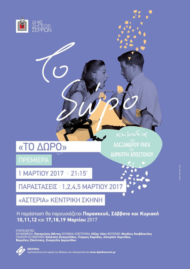 Αν θέλετε μια βραδιά για να γελάσετε και να το θυμάστε, το ΔΗ.ΠΕ.ΘΕ Σερρών σας την ετοίμασε και σας την παρουσιάζει με «ΤΟ ΔΩΡΟ». Ένα δώρο που μπορείτε να το απολαύσετε από την Τετάρτη 1η Μαρτίου μέχρι και την Κυριακή 19 Μαρτίου στο Δημοτικό Θέατρο «ΑΣΤΕΡΙΑ».
