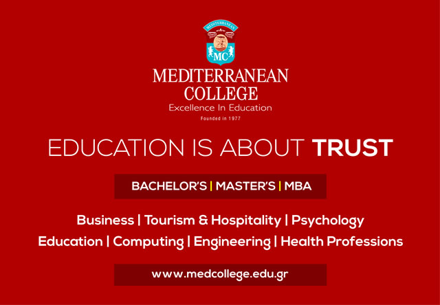 Σε συνεργασία με κορυφαία Βρετανικά Πανεπιστήμια (το TOP 50*UniversityofDerby, με βάση το Guardian University Guide για το έτος 2017 & το δημοφιλές ManchesterMetropolitanUniversity) το MediterraneanCollege αποτελείται από επτά (7) Ακαδημαϊκές Σχολές και προσφέρει 25 πρόσφατα ανανεωμένα Προπτυχιακά (Bachelor’s) και Μεταπτυχιακά (Master’s) προγράμματα σπουδών στους τομείς της Οικονομίας & Διοίκησης, της Πληροφορικής, της Ψυχολογίας, των Επιστημών της Αγωγής, της Μηχανικής, της Υγείας και του Τουρισμού-Φιλοξενίας.