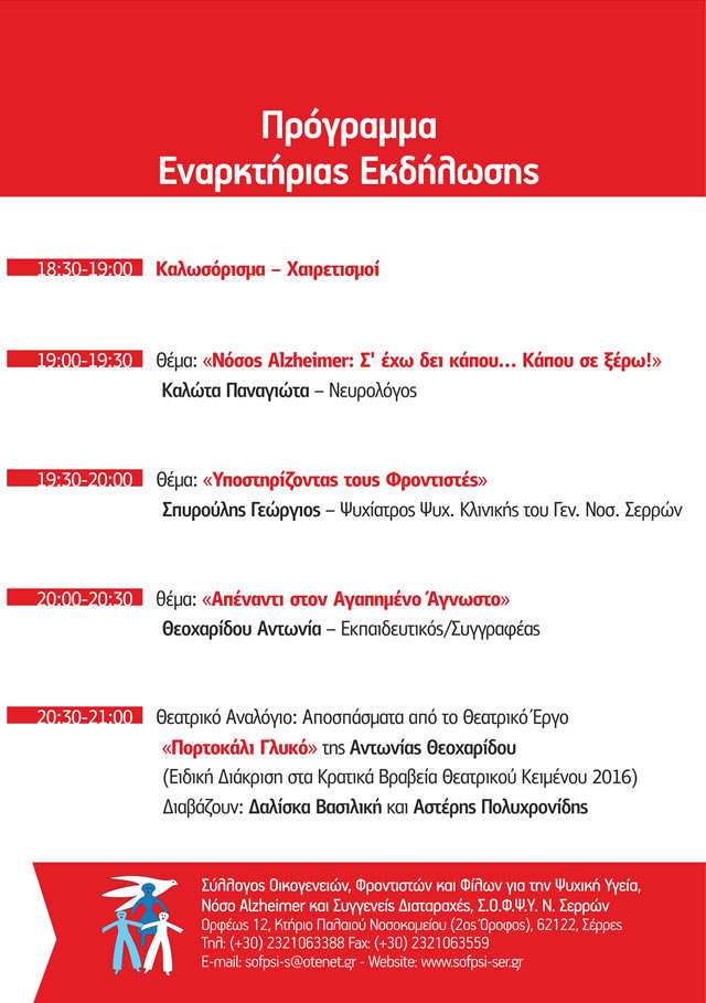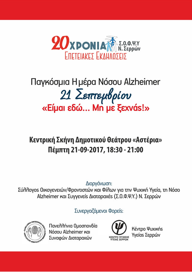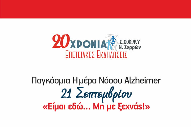 Ο Σύλλογος Οικογενειών/Φροντιστών και Φίλων για την Ψυχική Υγεία, τη Νόσο Alzheimer και Συγγενείς Διαταραχές (Σ.Ο.Φ.Ψ.Υ.) Ν. Σερρών, στα πλαίσια του εορτασμού των 20 χρόνων εθελοντικής δράσης και κοινωνικής προσφοράς, διοργανώνει από τις 21/09/2017 έως τις 08/10/2017 Επετειακές Εκδηλώσεις ενημέρωσης και ευαισθητοποίησης του κοινού.