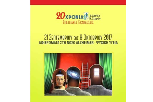 Ο Σύλλογος Οικογενειών/Φροντιστών και Φίλων για την Ψυχική Υγεία, τη Νόσο Alzheimer και Συγγενείς Διαταραχές (Σ.Ο.Φ.Ψ.Υ.) Ν. Σερρών, στα πλαίσια του εορτασμού των 20 χρόνων ασταμάτητης εθελοντικής δράσης και συνεχούς κοινωνικής προσφοράς του και με αφορμή την Παγκόσμια Ημέρα για την Ψυχική Υγεία - 10 Οκτώβρη, συνεχίζει τις Επετειακές Εκδηλώσεις ενημέρωσης και ευαισθητοποίησης της κοινότητας ως τις 08/10/2017.